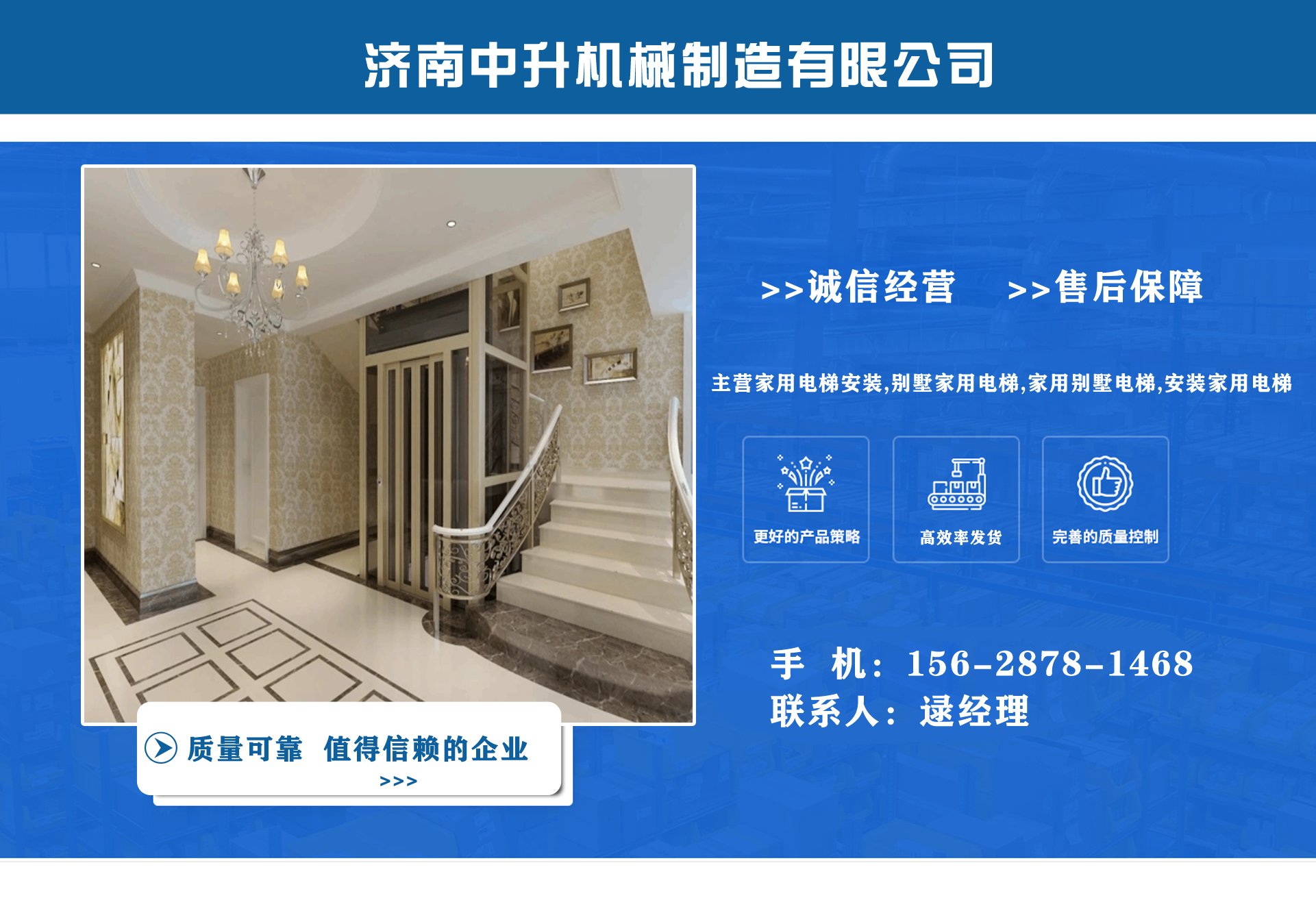 濟南中升機械制造有限公司主營家用電梯安裝,別墅家用電梯,家用別墅電梯,安裝家用電梯等業(yè)務,質量可靠,值得信賴! 公司為客戶提供免費上門測量,根據(jù)實際情況1對1服務,保障符合用戶需求,終身提供售后服務,讓用戶買的舒心用的放心。匠心團隊,打造信賴產品,我們有團結、奮進拼搏的匠心團隊,為您提供可信賴的品質保證。 從創(chuàng)立以來一直嚴格執(zhí)行質量管理體系、環(huán)境管理體系等相關標準管理體系,“顧客滿意”是我們始終如一的追求。我們有屬于自己培養(yǎng)的安裝隊伍,24小時服務電話,為您提供可靠的服務與支持?! ∥覀兊脑妇笆墙ㄔO國內具有影響力的電梯公司,做城市美好空間的好伙伴。...